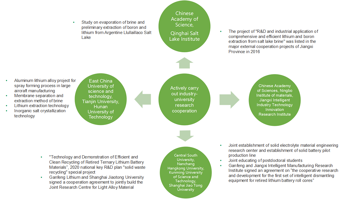 Ganfeng upholds the concept of "openness, cooperation, and win-win", and actively develop in-depth integration of production, education, research and use with universities or scientific research institutions, forming a set of practical and effective innovation cooperation mechanisms. The Company jointly builds scientific research institutions at the national and provincial levels to undertake major scientific and technological projects, and perform joint technological research. These efforts have enhanced the company's scientific and technological innovation capabilities, and won the title of "Jiangxi Foreign Cooperation Base and Intelligence Introduction Demonstration Base".